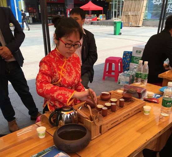 我院20多位学生包括7名茶艺表演者主要在CBD商业中心门面前进行共品茶为主题的茶艺展演。7名茶艺表演者对泡茶、冲泡、湿壶、烫壶、投茶、悬壶高冲和敬茶等茶艺进行了展示,还开展了现场发放茶文化宣传资料、以免费品茶进行讲座等形式与市民们共同体验茶文等一系列活动。