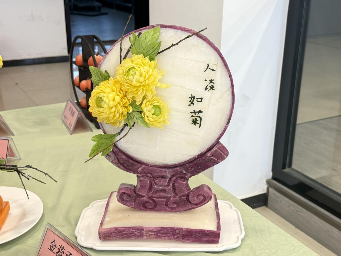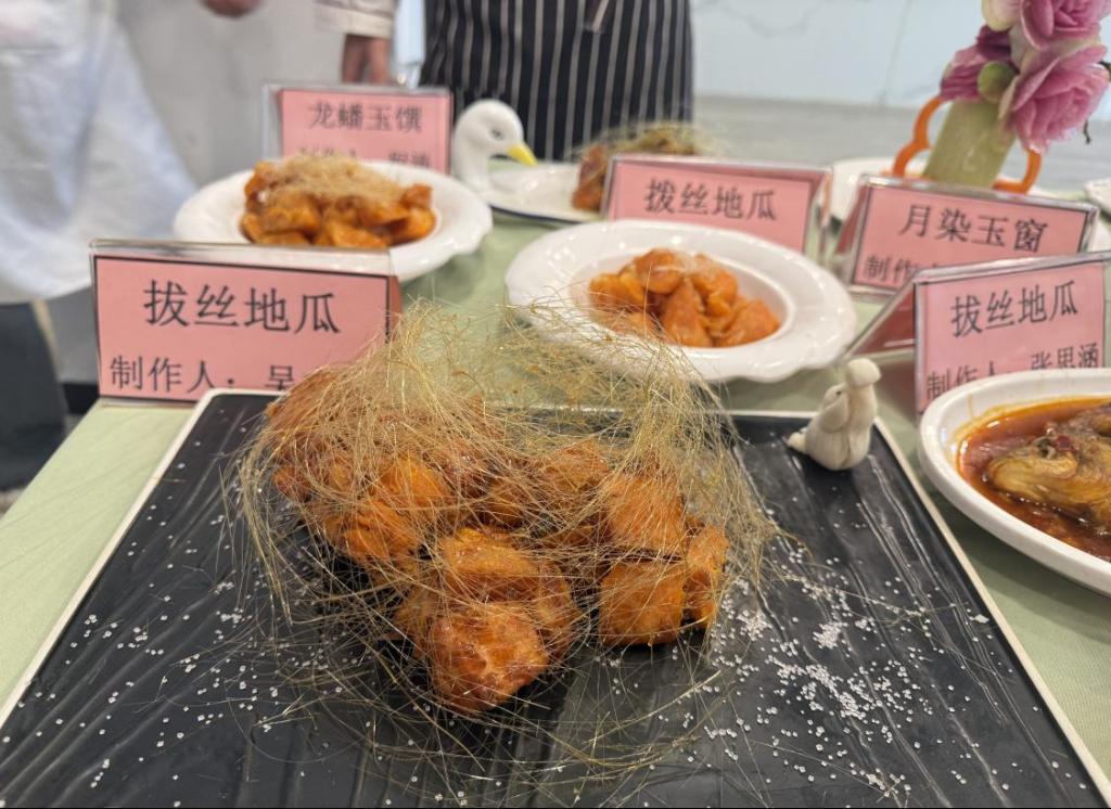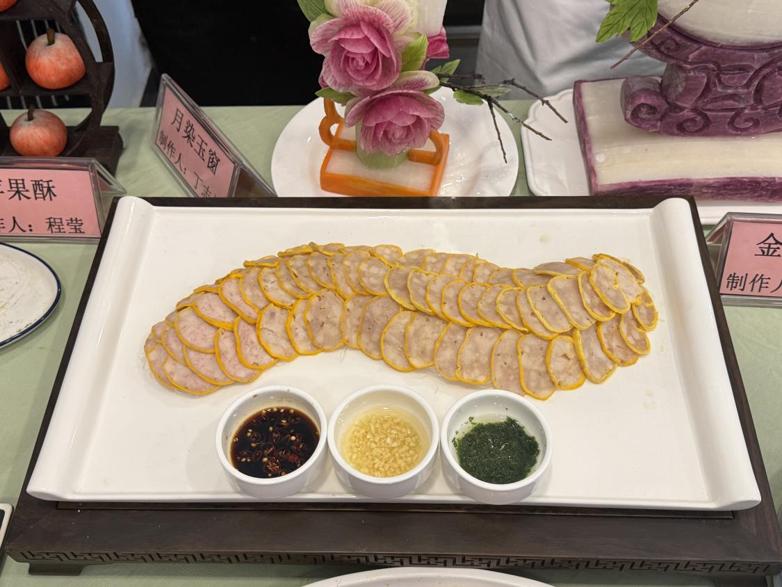 比赛中,学生展示了多样菜品与作品,如造型细腻的“孔雀武昌鱼”、火候到位的红烧武昌鱼、考验技术的拔丝地瓜、体现地方风味的“江西辣鸡爪”,以及融合楚文化的“黄金糕”、蕴含传统文化元素的“龙蟠玉馔”等。雕刻作品“月染玉窗”“金蕊承光雕”形象生动,各类酥点造型逼真、口感酥脆。学生在实践中展现了扎实的技能与创新意识。