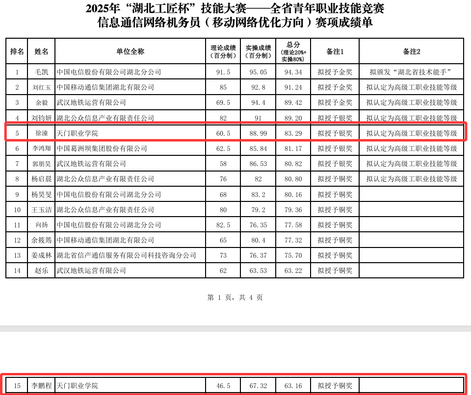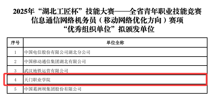 近日,由湖北省人力资源和社会保障厅、共青团湖北省委共同主办的2025年“湖北工匠杯”技能大赛——全省青年职业技能竞赛信息通信网络机务员(移动网络优化方向)赛项在湖北省邮电学校圆满落幕,全省23家单位、50名选手参赛。AC米兰中文官方网站电子信息技术学院教师徐潼、李鹏程凭借过硬的专业技能,从强手如林的赛场中脱颖而出,分别获得银奖和铜奖,AC米兰中文官方网站获得“优秀组织单位”荣誉称号。