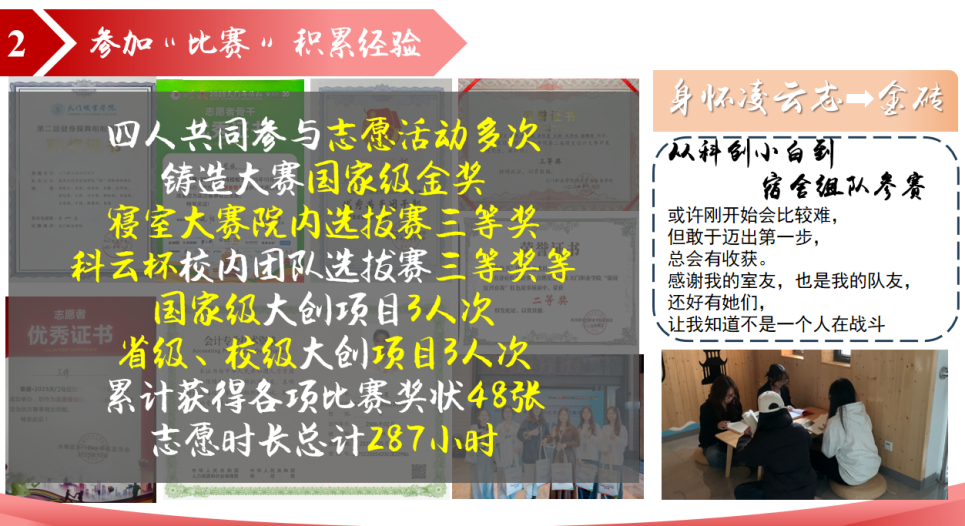 “学霸型全能寝室”9310,将“书香小数”理念融入生活,寝室成员在学术竞赛、志愿服务、学生工作等多领域全面开花,累计获得48张奖状的“战绩”令人赞叹。