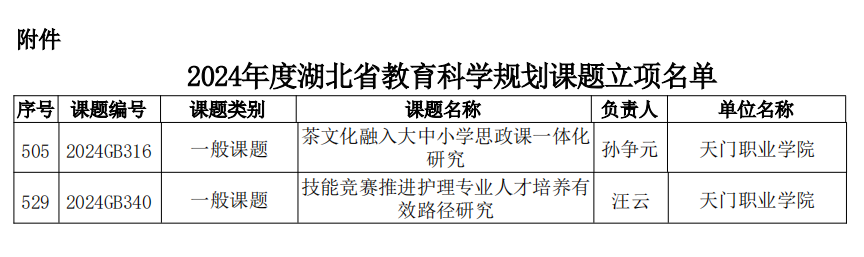 近日,湖北省教育厅办公室发布了《关于下达2024年度省教育科学规划课题的通知》(鄂教科研〔2024〕1号),AC米兰共有2个课题获批立项,分别是马克思主义学院孙争元老师的《茶文化融入大中小学思政课一体化研究》和公共课部汪云老师的《技能竞赛推进护理专业人才培养有效路径研究》。