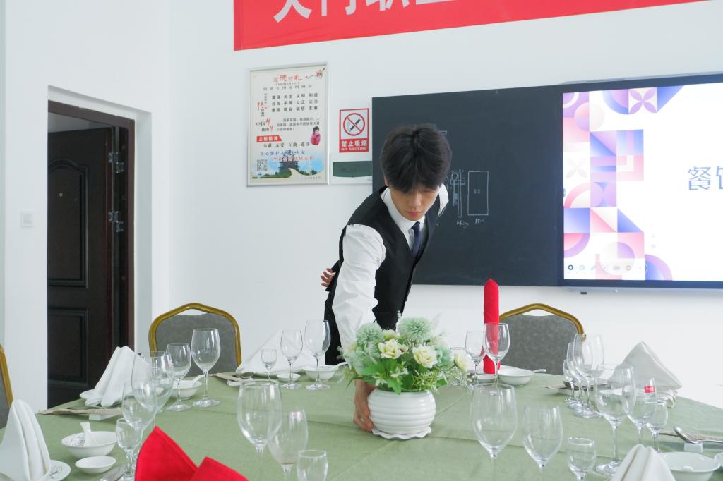 酒店管理专业赛道则以“中餐宴会服务”为核心,涵盖骨碟定位、餐具间距测量、餐巾折花造型、酒水斟倒标准等十多项规范化操作流程。选手们在限定时间内完成从台面布局到礼仪展示的全流程服务,将中式餐饮文化的典雅韵味与现代服务规范深度融合,充分体现了文化素养与实操能力的协同提升。