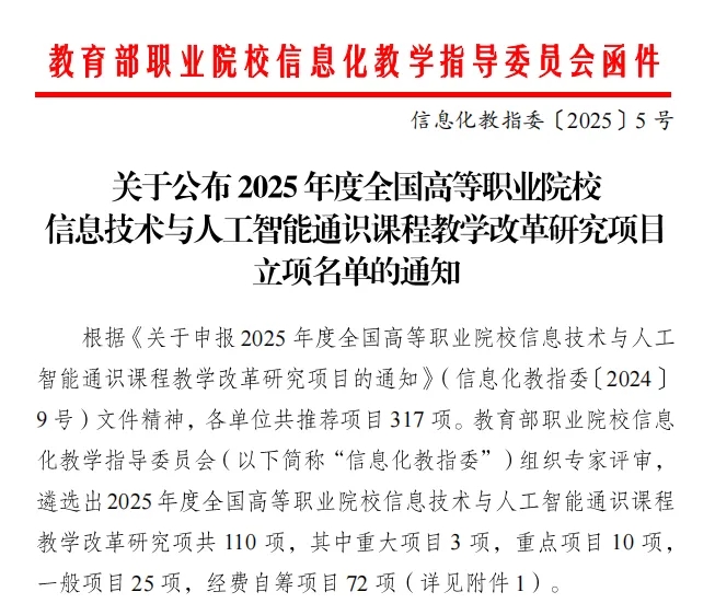 近日,教育部职业院校信息化教学指导委员会(以下简称“信息化教指委”)、教育类专业教学指导委员会(以下简称“教育教指委”)分别公布了2025年度立项课题名单。
