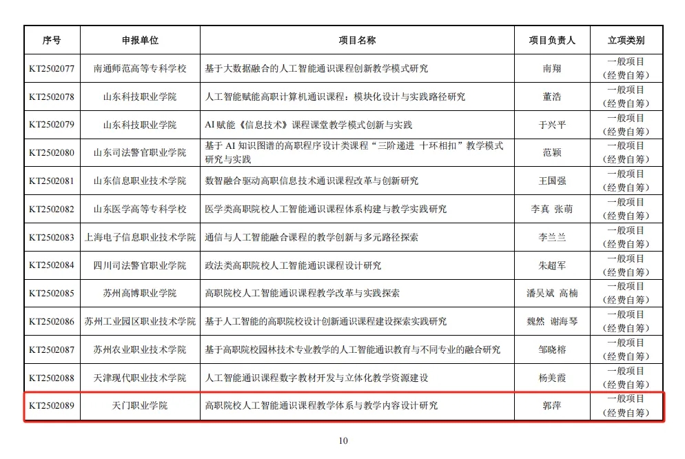 《高职院校人工智能通识课程教学体系与教学内容设计研究》(主持人:田刚)和《高职院校人工智能通识课程教学模式研究》(主持人:阳军)获批信息化教指委重点课题立项。