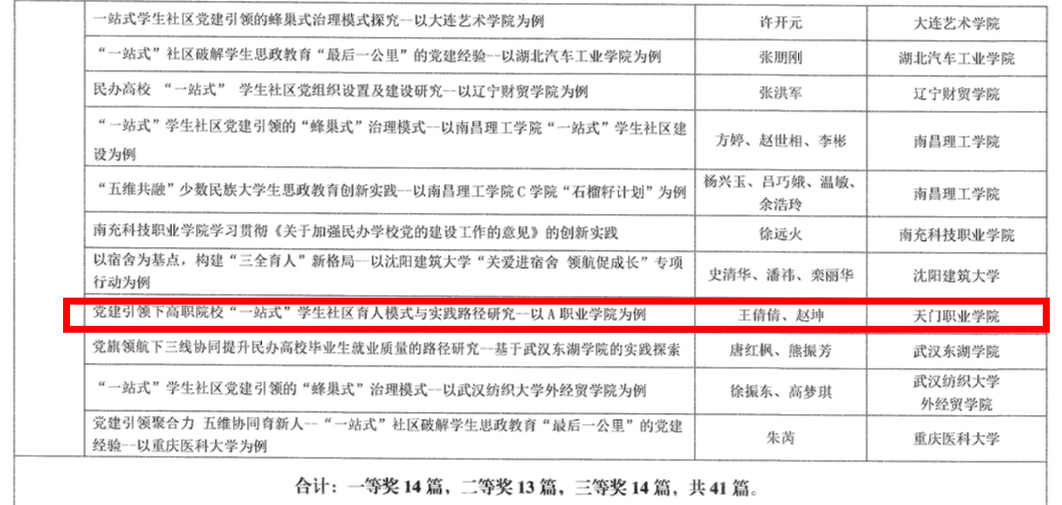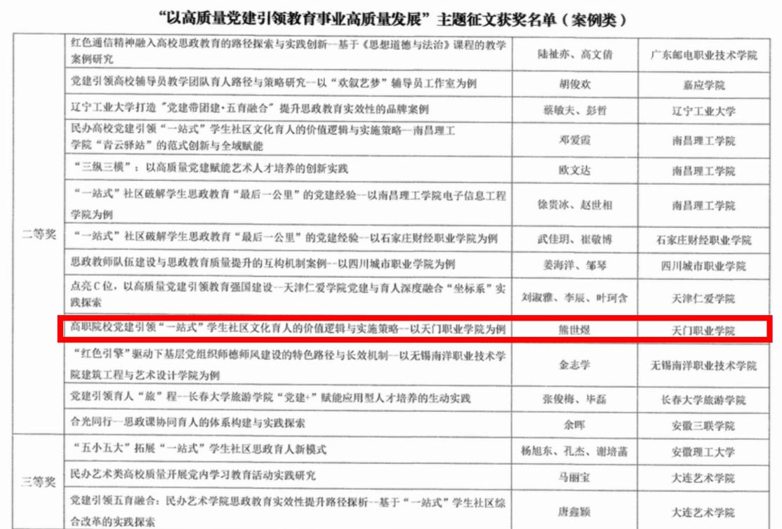 其中,熊世煜老师独立撰写的《高职院校党建引领“一站式”学生社区文化育人的价值逻辑与实施策略——以AC米兰中文官方网站为例》荣获案例类二等奖。王倩倩、赵坤老师共同署名的《党建领引下高职院校“一站式”学生社区育人模式与实践路径研究——以A职业学院为例》荣获案例类三等奖。