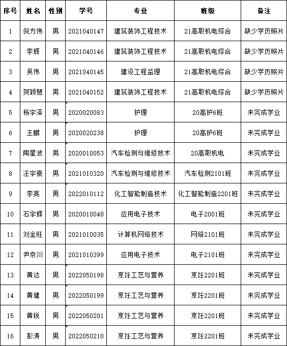 以上16名学生将不予进行学籍学历电子注册,做留级处理,现予以公示。公示期内如有疑问,应及时与学生工作处联系,联系电话:0728-5364931。