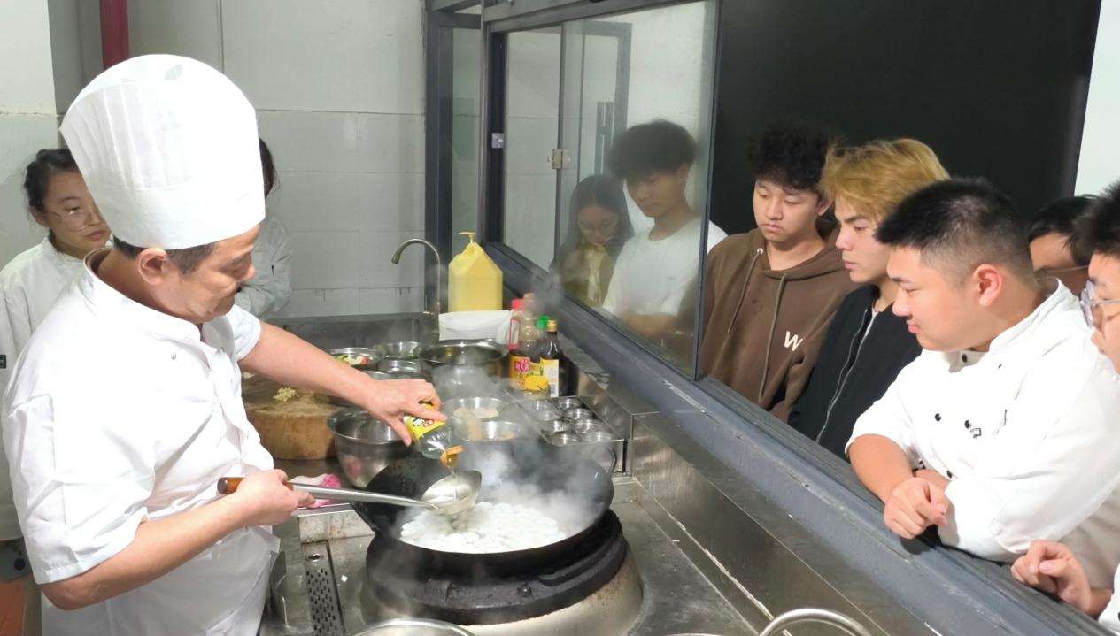 活动中,黄志雄大师以天门地方名菜“桔瓣鱼氽”“鳝鱼片”为教学载体,开展现场实操教学。从食材甄选的核心标准、刀工切割的精准技法,到调味配比的独家秘诀、烹制火候的把控要点,黄大师均进行分步拆解与专业演示,通过“理论讲解+实操示范”的模式,让师生直观感受传统烹饪技艺的精湛魅力与文化内涵。