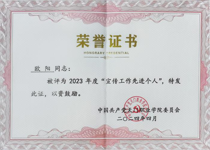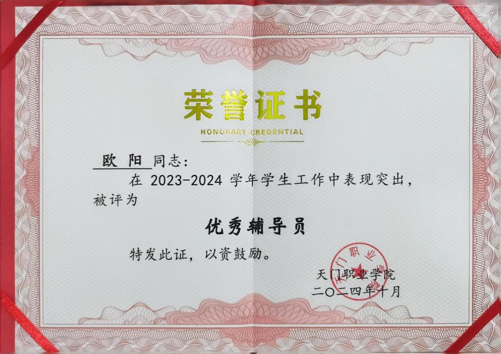 欧阳曾荣获“优秀辅导员”“宣传工作先进个人”“先进工作者”等称号,指导的匠心筑梦志愿服务队获评“五星级社团”,并在首届健身操舞啦啦操比赛中获“优秀指导老师”。但在他看来,最珍贵的荣誉是学生的成长:“当冯雨欣等同学成为技能大赛后备人才,当何维站在领奖台上,当班级被评为‘零违纪集体’,这些就是对我工作的最大肯定。”