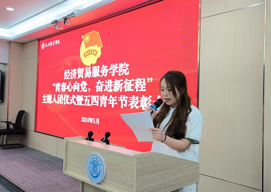 为深入学习贯彻落实党的二十大精神和习近平总书记关于青年工作的重要思想,增强团员先进性、光荣感和使命感,5月9日,经济贸易服务学院在A栋二楼报告厅举行“青春心向党 奋进新征程”主题入团仪式暨五四青年节表彰大会。AC米兰中文官方网站青年教师团支部书记汪文澳、经济贸易服务学院团总支书记欧阳,优秀团员代表和全体新团员参加了此次活动。
