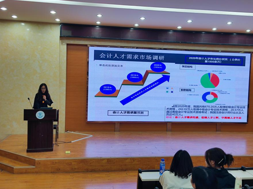 宣讲会开始由李伟老师对电子商务专业、网络营销与直播电商专业的新生做专业介绍。李伟老师主要从学习目的、如何达到学习目标、学院能为学生提供怎么样的师资条件和硬件条件帮助学生实现目标、不同学习阶段的侧重点为学生做了介绍。宣讲会第二场由李娜老师针对大数据与会计专业的学生做专业介绍。李娜老师首先从我国近年来就业情况为同学们介绍了会计专业的人才供需现状;紧接着又从专业特色、专业场景、人才培养方案、课程设置对大数据与会计专业进行了详细阐述,最后,李娜老师介绍了学生在校期间可以参加的各项竞赛与活动。