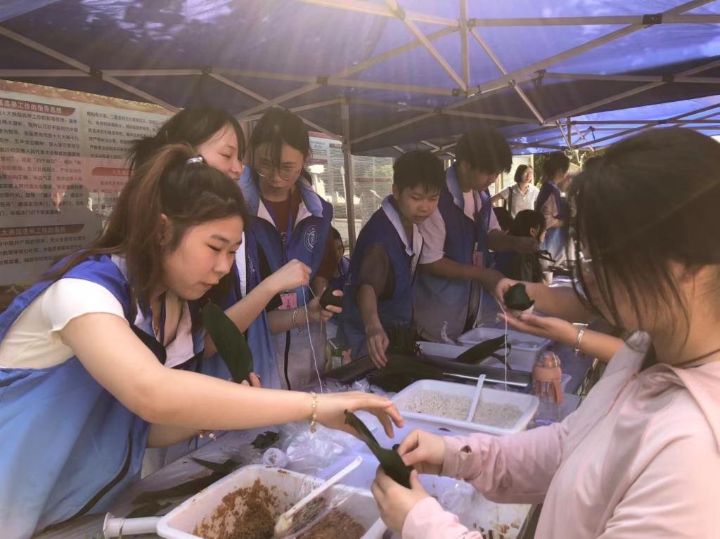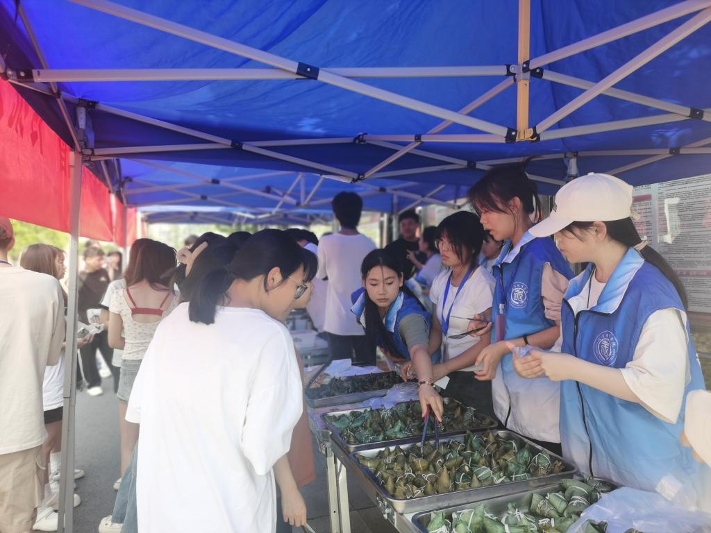 活动现场,同学们通过“丢沙包”游戏、端午习俗知识竞答、体验制作粽子三种方式获得卡片,凭借卡片领取粽子。趣味的活动吸引了往来的学生驻足参与。“先把粽叶铺平,再依次放入米、馅料,然后把粽叶对折回来,最后用力交叉缠线……一定要压实,否则容易散。”现场工作人员一遍遍地演示包粽子的方法,前来体验的同学们仔细聆听、动手操作。不一会,一个个小巧精致、憨态可掬的粽子便做好了。随园食社负责将包好的粽子煮熟,再进行分发。同学们不仅能享受到包粽子的乐趣,还能品尝到自己的劳动成果。