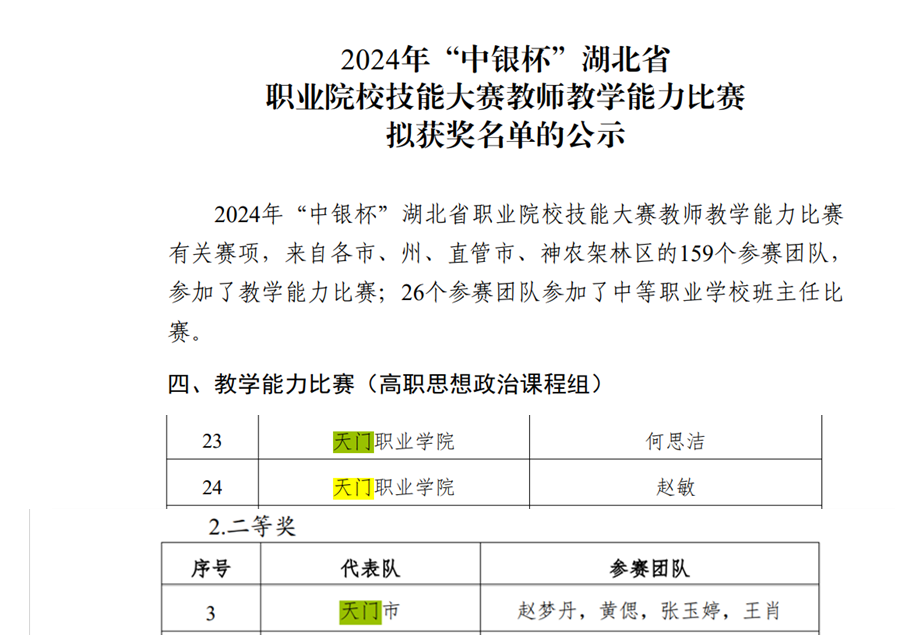 (通讯员:王坤)近日,2024年“中银杯”湖北省职业院校技能大赛教师教学能力比赛落下帷幕,AC米兰思政教研室赵敏、何思洁获教学能力比赛(高职公共基础课组)个人三等奖,心理教研室赵梦丹、黄偲、张玉婷、王肖获教学能力比赛(中职思想政治课程组)团队二等奖,这是马克思主义学院教师首次在省级教师教学能力比赛中获奖。