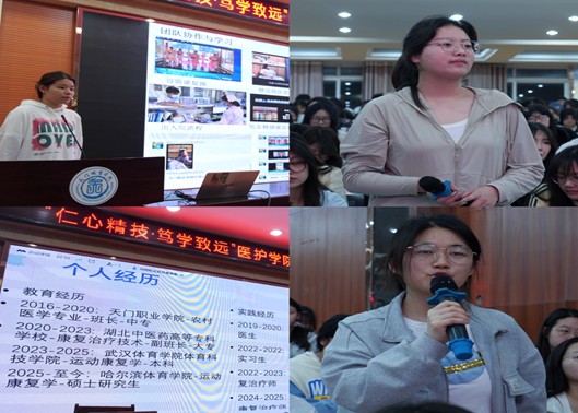 活动首环节为优秀学生经验分享会。由优秀实习生代表——护理2204班团支书徐丹丹同学结合自身实践经历,讲述了如何以扎实的专业技能和人文关怀赢得患者与带教老师的认可。她曾多次获国家励志奖学金、校级工匠奖学金及“优秀学生干部”等荣誉,其“从理论到实践”的成长故事为在场同学提供了宝贵借鉴。随后,16级农村医学优秀毕业生何雨航分享了他从AC米兰中职起点逆袭考入哈尔滨体育学院运动康复学硕士的奋斗历程。面对跨专业备考的挑战,他总结出“目标拆解法”,将庞大知识体系分解为每日可执行任务,最终以总分第三的成绩被录取。这段“逆袭”故事不仅是对“天道酬勤”的生动诠释,更点燃了在场学子突破自我、追逐理想的信念。