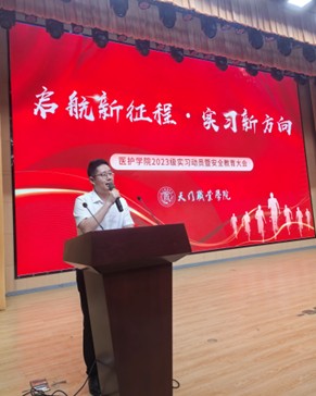 2025611日晚,医护学院在图书馆报告厅隆重举行2023级实习动员暨安全教育大会。本次大会以“安全第一,规范先行”为主题,为即将奔赴临床一线的实习生们提供全面指导。医护学院党支部副书记赵梦丹主持大会,实习管理科刘丹老师作专题安全培训,副院长胡伟伦出席并作重要讲话,2023级全体实习生参加大会。