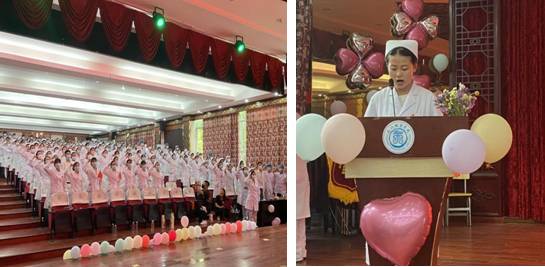护理2002班赵良实同学代表即将实习的学生发言,她说,作为护理学生,在看到前辈忙碌身影的同时,更要看到她们奔跑却不觉疲惫的精神。应注意理论与操作结合,书本与想法碰撞,时刻牢记南丁格尔的誓言,不辱使命,为人类的发展贡献一份微薄的力量。