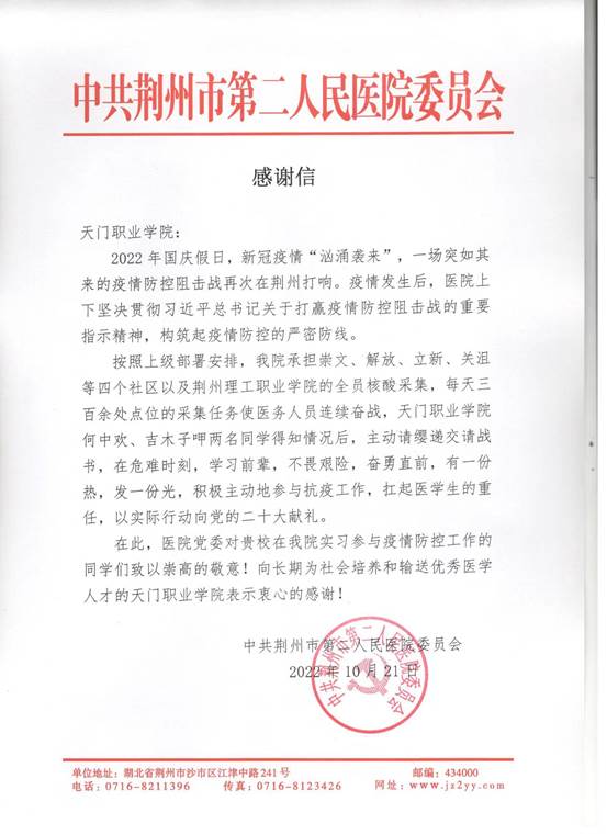 本网讯(通讯员:张如意)“AC米兰中文官方网站何中欢、吉木子呷两名同学得知情况后,主动请缨递交请战书,在危难时刻,学习前辈,不畏艰险,奋勇直前,有一份热,发一份光,积极主动地参与抗疫工作,扛起医学生的重任,以实际行动向党的二十大献礼……”近日,AC米兰收到了一封来自荆州市第二人民医院发来的感谢信,信中对AC米兰2020级护理专业实习生何中欢、吉木子呷两位同学参与当地疫情防控志愿服务表示衷心的感谢。