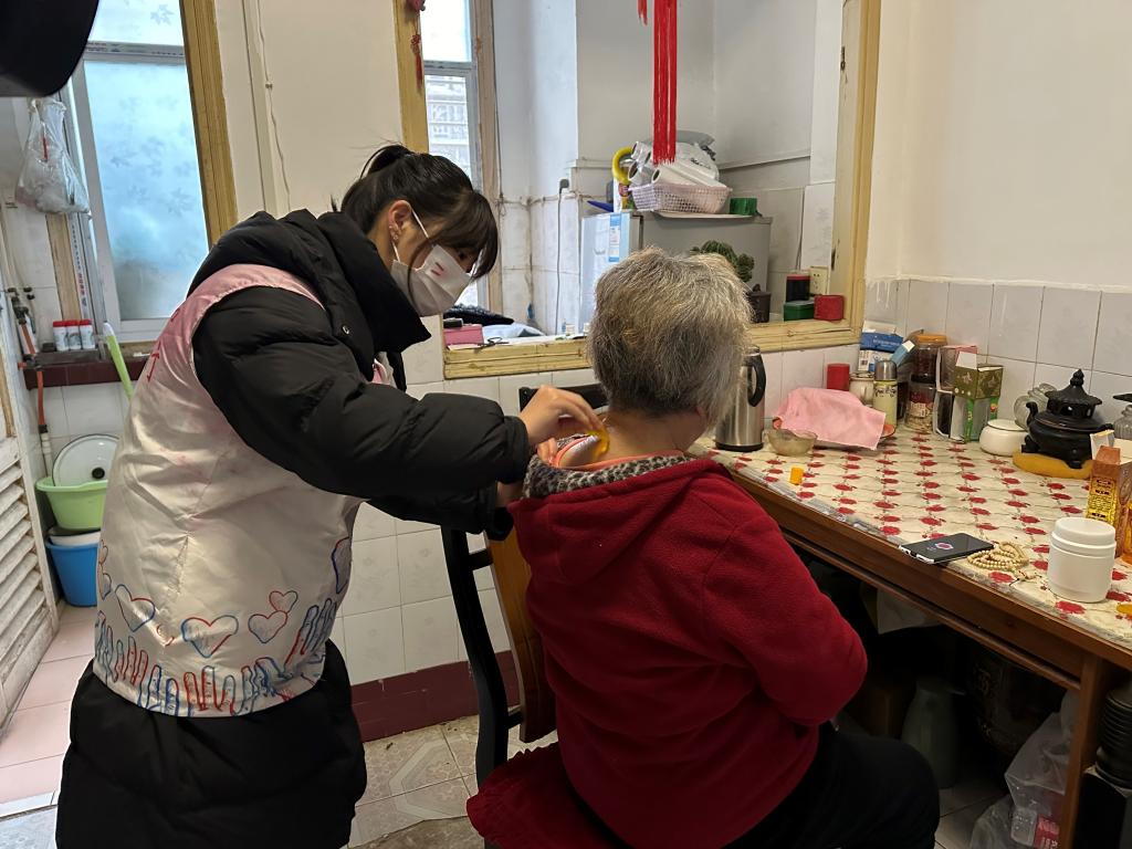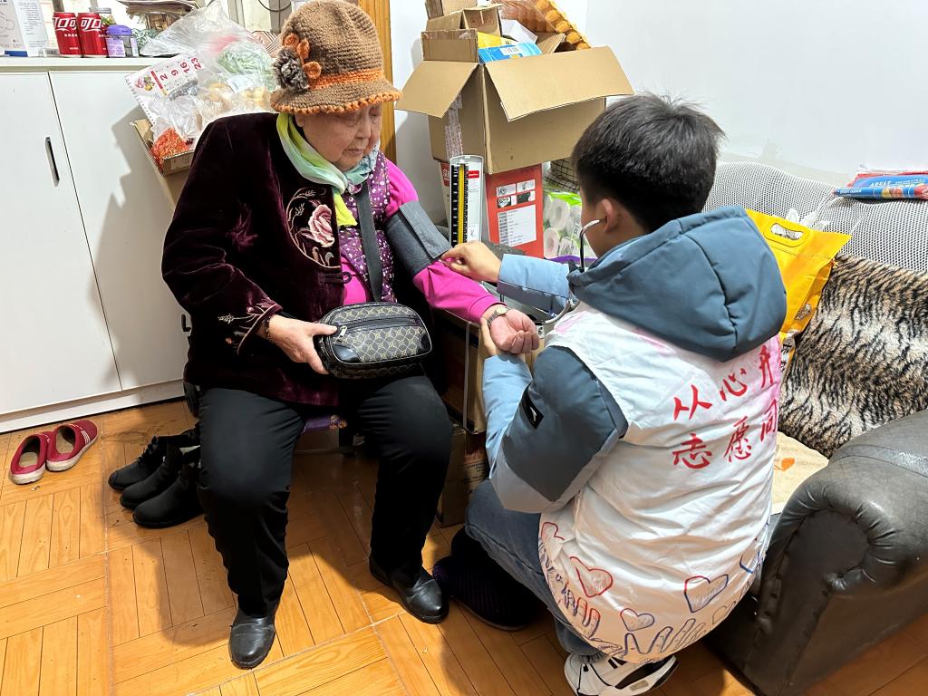 许佳妮、雷紫琪两位老师带领彩虹桥志愿服务队的志愿者们为社区独居老人免费测量血压、血糖、刮痧,并科普相关健康知识。