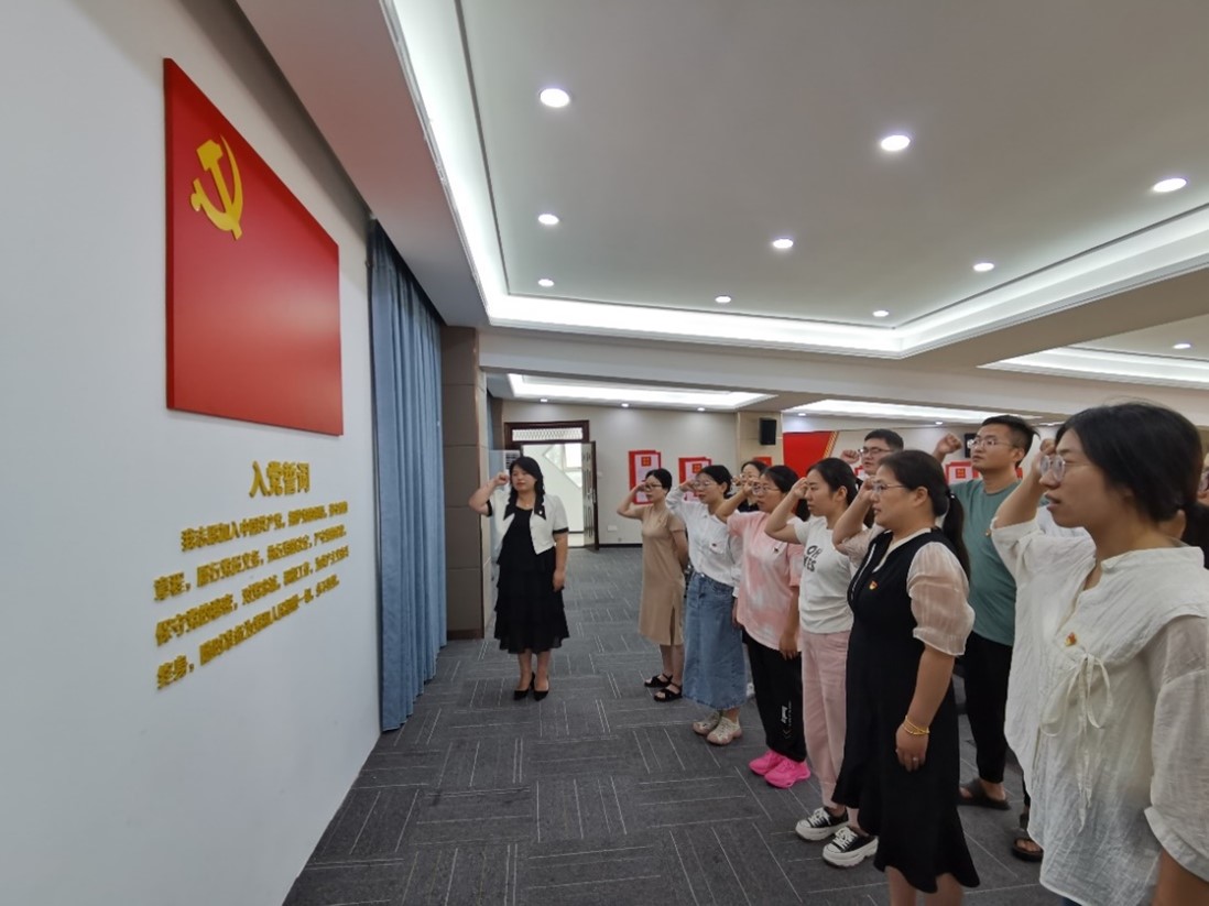 在庄严的党旗下,党员教师们齐声宣誓,宣誓声中回望初心、坚守本心,再次感受到作为一名共产党员的神圣使命和庄严承诺。
