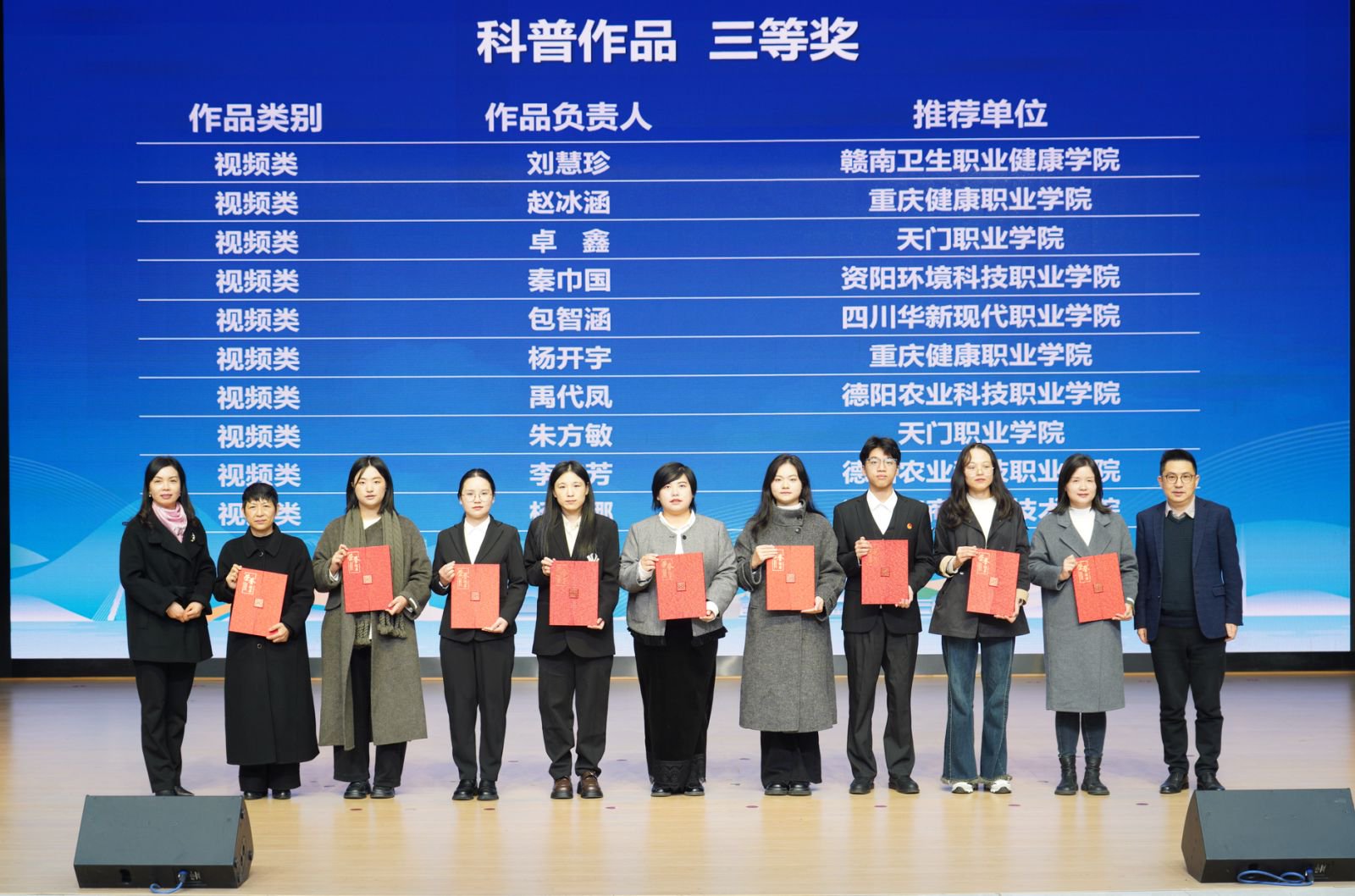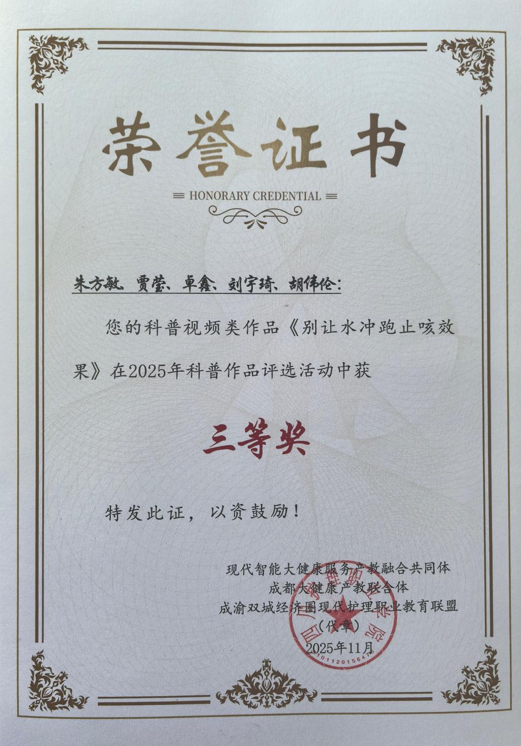 会上,揭牌成立了西部首个智慧康养产业学院——四川护理职业学院德阳文旅大健康智慧康养产业学院,举行了共同体、联合体和联盟2025年度科普作品颁奖仪式和科研项目申报指南发布仪式,并为现代智能大健康服务产教融合共同体副理事长单位授牌。我院由卓鑫、朱方敏、贾莹、刘宇琦、胡伟伦拍摄的《卡喉别慌,海姆立克来救场》、朱方敏、贾莹、卓鑫、刘宇琦、胡伟伦拍摄的《别让水冲跑止咳效果》均获得科普视频类作品三等奖。