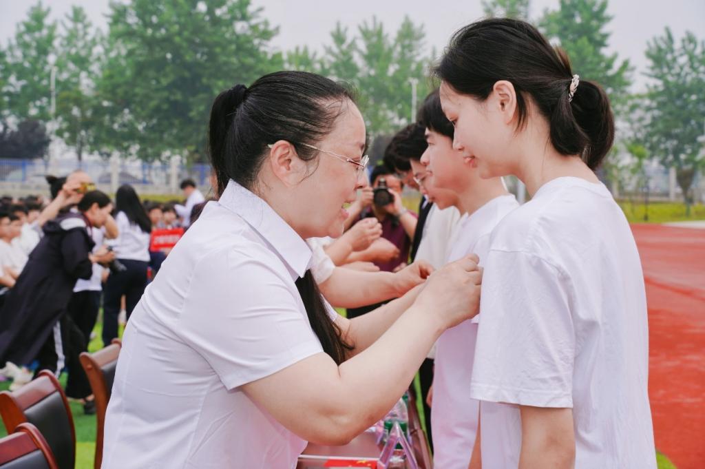 随后,师长为学生佩戴成人纪念章并献上最真挚的祝福。学生三次鞠躬,谢生养之恩、感教诲之情、立报国之志。