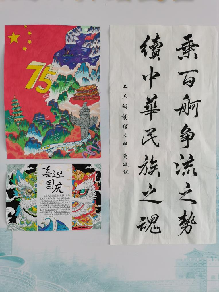 作品征集阶段,各年级积极响应,共报送参赛作品67幅。校团委组织评委评选出优秀作品16幅,其中一等奖3名,二等奖5名,三等奖8名。这些作品主题鲜明,涵盖了书法、绘画以及手抄报等多种形式,书法作品神韵十足,绘画作品丰富细腻,手抄报则图文并茂,展现出学生们的巧妙构思与精湛技艺,饱含对祖国的深情赞美和美好祝愿。