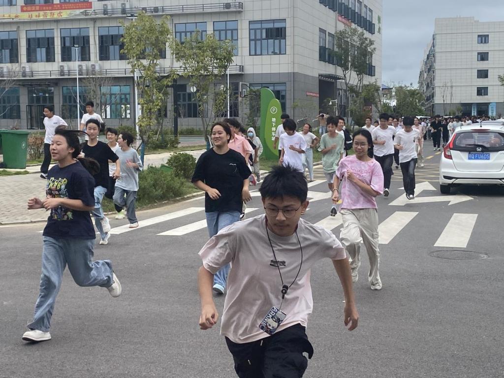 当天,随着消防警报声响起,演练正式开始。全体师生按照预定疏散路线,在疏散引导人员的指引下,迅速、有序地从宿舍楼等场所撤离。大家弯着腰,用手帕、衣袖等捂住口鼻,沿着安全通道快速前进。按照规定要求,全体师生需在 3 分钟内完成疏散,最终,所有师生都安全、及时地抵达集合地点。