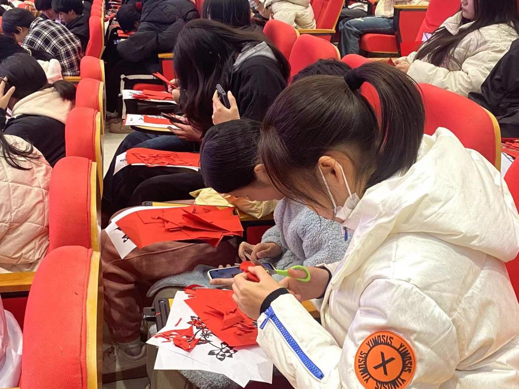 活动第二阶段则是剪纸大赛,100余名选手现场动手完成参赛作品。同学们满怀热情与信心,展示了自己在剪纸课程中所习得的剪纸技艺以及独特创意,他们手持工具,神情专注,在纸张上精心雕琢。一时间,纸屑纷落,一张张普通的宣纸在他们的巧手下逐渐变成了栩栩如生的花朵、动物和人物等形象。